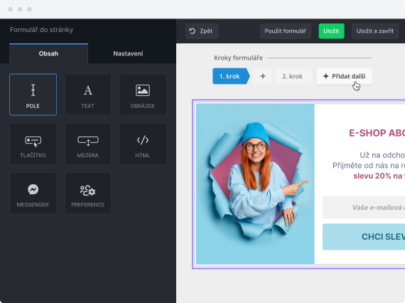 Snadno si je vyrobíte v našem drag & drop editoru přesně podle vašich představ. U hotového formuláře už jen nastavíte, na jaké stránce a kdy se má uživateli zobrazit a jednoduše přidáte na web. Nové kontakty budou automaticky padat do seznamu kontaktů v Ecomailu.